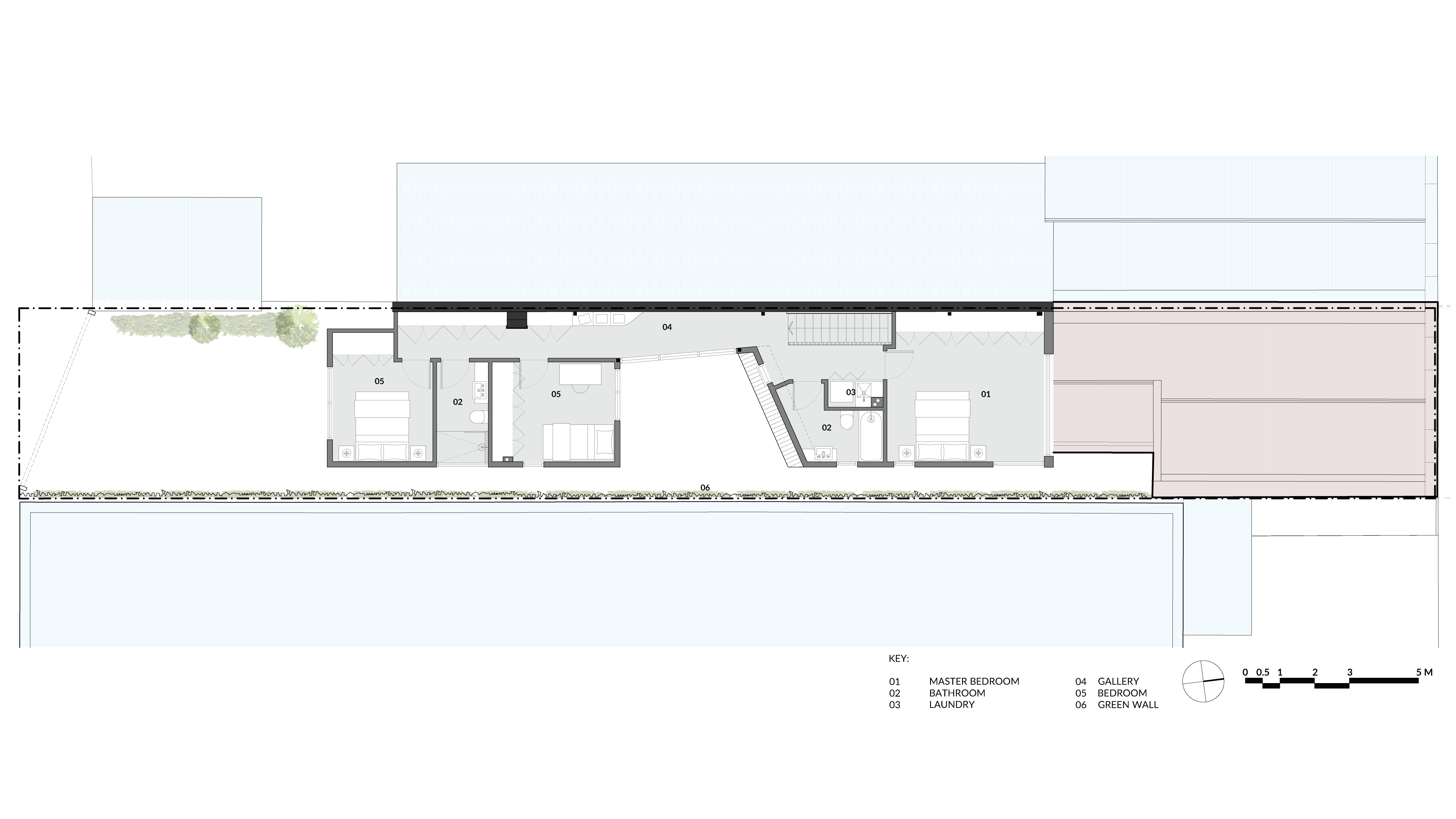 Sitting on a 5.5m wide site, and bounded by 6m high walls and behind an existing shop, this 3 bedroom family home in Melbourne's inner west has deployed a number of clever strategies to transcend its constraints. A light filled courtyard occupies the centre of the home, creating a sense of interconnectedness and expansiveness, where in reality the dwelling is in some places as little as one metre in width. The courtyard allows daylight to enter deep into the living spaces despite a challenging orientation. It also drives a passive cross ventilation strategy across the entire home, through creating a pressure differential - a device that has been used for centuries. A double height glazed wall also partially acts as a trombe wall, capturing early morning solar gain onto the retained masonry party wall and providing passive heating in winter. In warmer months this is able to be controlled by blinds.